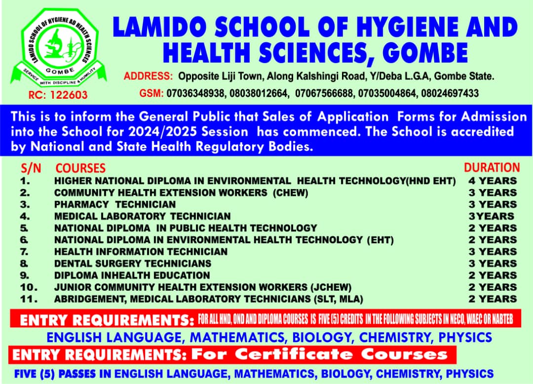 Lamido school of hygiene and health sciences Gombe is the oldest and standard private tertiary health institution in Gombe State.